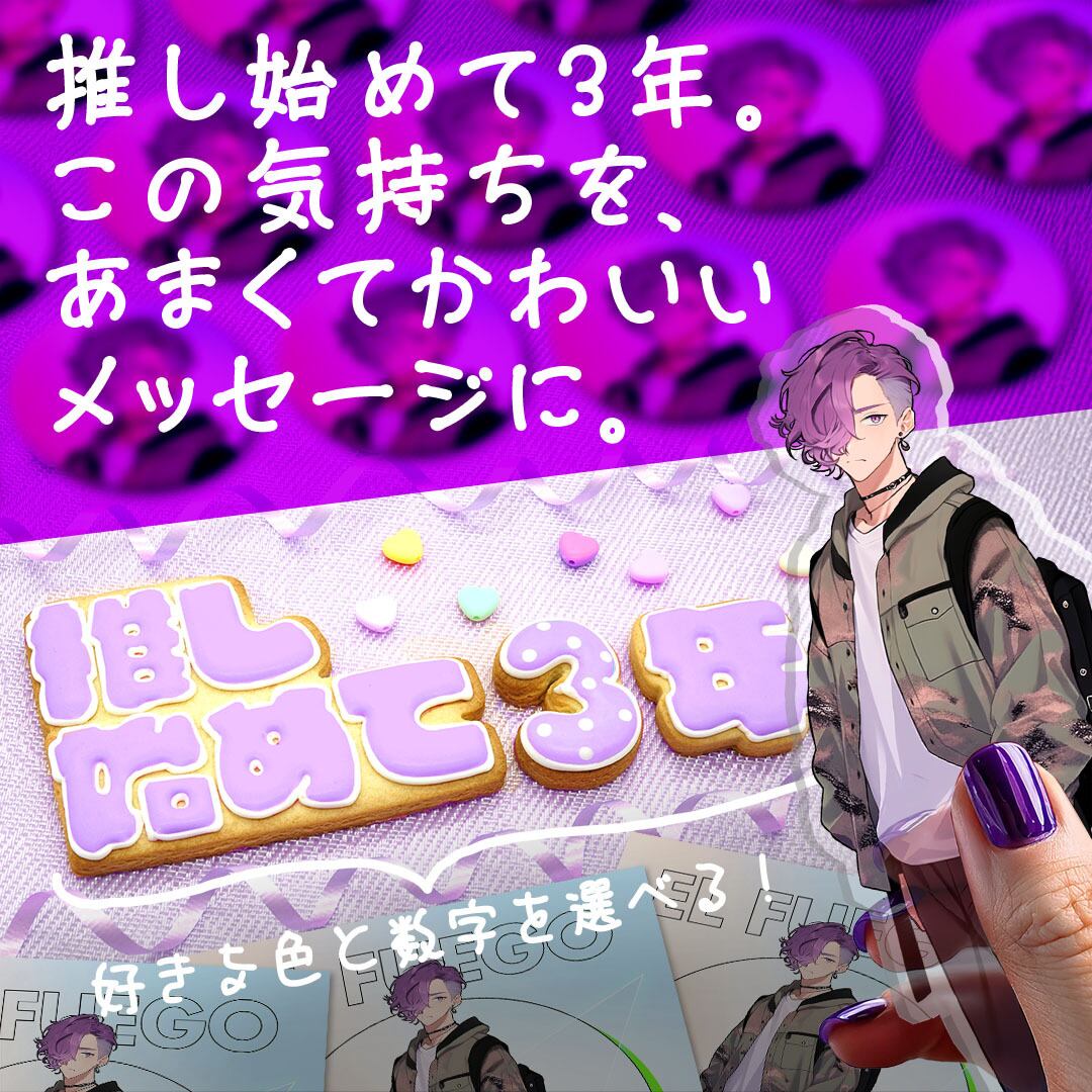 別売りの「推し始めて」などの記念日クッキーや数字クッキーと組み合わせて使える、単位「年」のクッキーです。色も選べて、推し様とあなただけの特別な一品になります。
