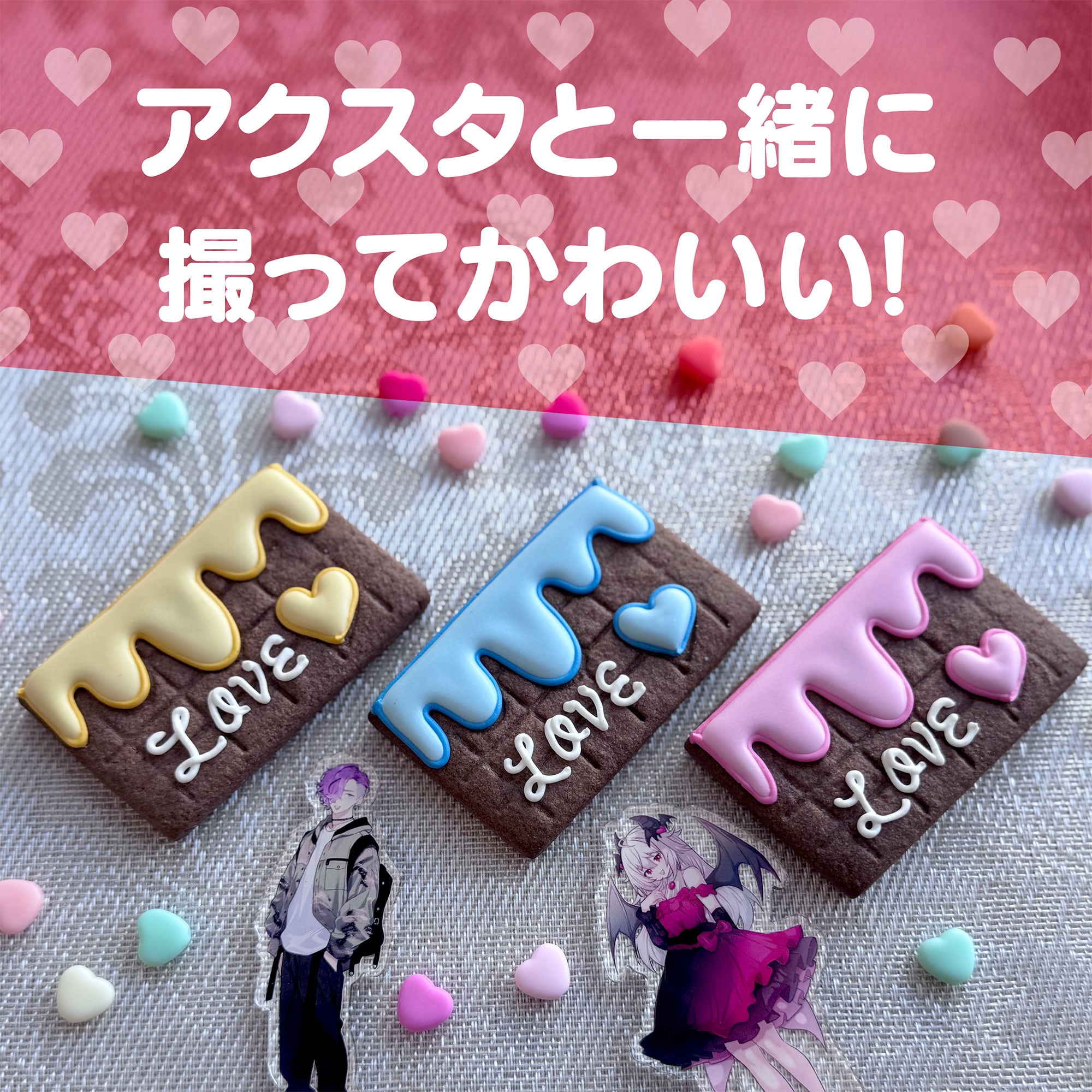 かわいくとろけるチョコを表現したアイシング部分は9色から選べるので、ぜひあなたの推し色を見つけてください♥ アクスタやぬいと一緒に写真を撮れば、記念日がさらに盛り上がること間違いなしです…!