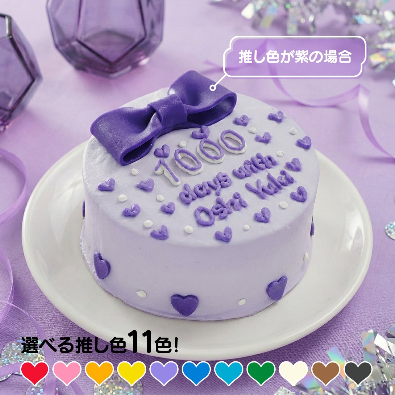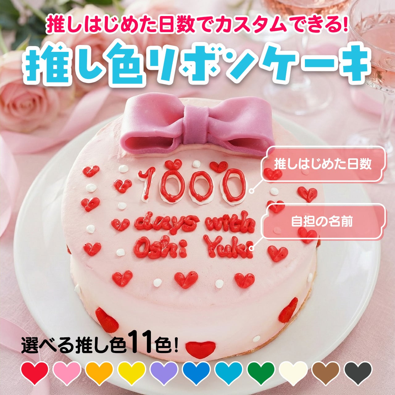 あなたが推しを推しはじめた日/月/年の数でお祝いできる、推し色でカスタムできるリボンケーキが新登場! 生クリームを使用した、ホイップクリームベースのケーキです(中のフルーツは12~5月はいちご、6月から11月は黄桃になります)