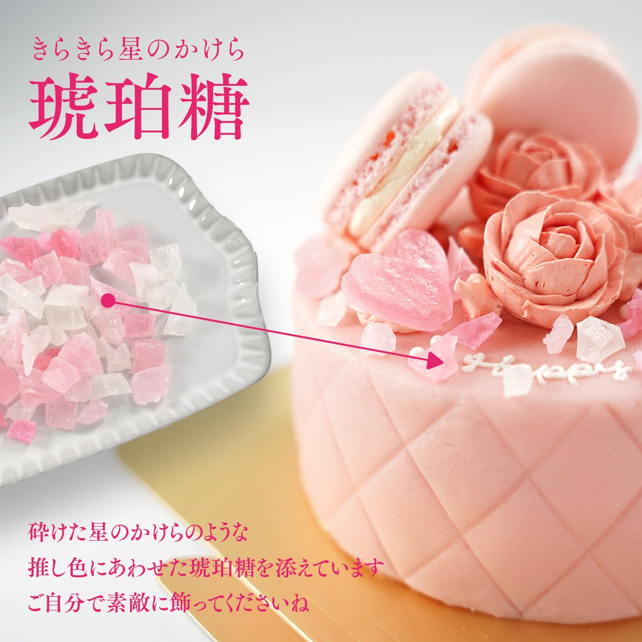● マカロン、薔薇、琥珀糖はベースカラーと同系色ですが、多少色味の差があります
